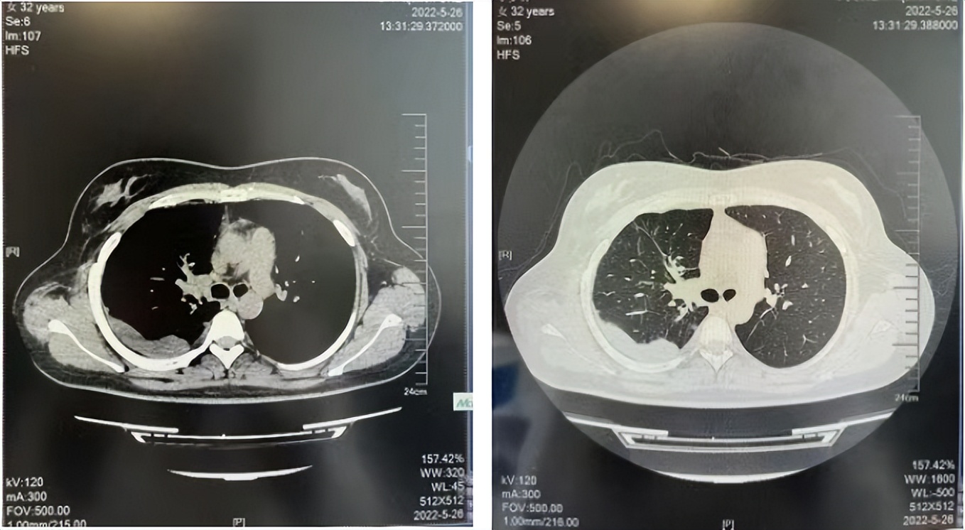 34岁,女性,无吸烟史饮酒史,既往体健。2015年11月无明显诱因出现咳嗽咳痰,痰为黄色粘液状,就诊于铁西华康医院,胸部CT示右肺上叶尖段可见结节影,邻近胸膜局限牵拉。2015年12月于胸科医院行肺肿物穿刺活检病理回报为肺腺癌。2015年12月16日全麻下行右肺上叶肺癌根治术及纵隔淋巴结清扫术,术后病理:肺组织中部分脉管内见腺癌组织,断端支气管旁淋巴结内见癌组织,淋巴结中见到转移癌(2/6),未行基因检测。