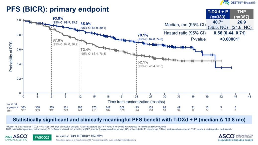 DB-09研究成功挑战了当前HER2阳性晚期乳腺癌的一线治疗标准THP方案(紫杉醇+曲妥珠单抗+帕妥珠单抗)。研究结果显示,T-DXd联合帕妥珠单抗组的中位无进展生存期(mPFS)达到40.7个月,较THP方案显著降低44%的疾病进展或死亡风险。值得注意的是,该研究纳入了少数基线无症状脑转移患者(T-DXd联合帕妥珠单抗组与THP组分别为25例与22例),结果显示无论是否存在脑转移(HR 0.30 vs 0.58),患者均能获得显著的PFS获益。