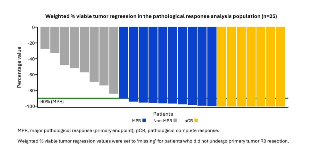 研究主要终点为经本地评估的主要病理缓解(MPR),定义为肿瘤残余存活细胞比例≤10%;次要终点包括病理完全缓解(pCR)、影像学缓解、淋巴结降期及安全性。