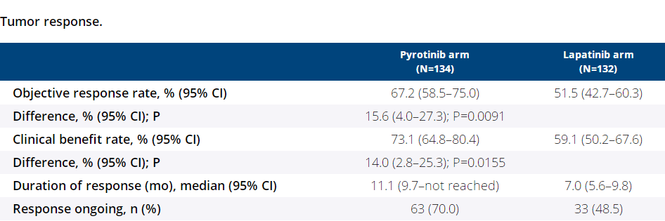 同时,两组患者在客观缓解率(ORR,67.2% vs 51.5%)、临床获益率(CBR,73.1% vs 59.1%)、中位持续缓解时间(DoR,11.1个月 vs 7.0个月)等方面都存在明显差异。安全性方面,最常见的≥3级不良事件是腹泻和手足综合征。