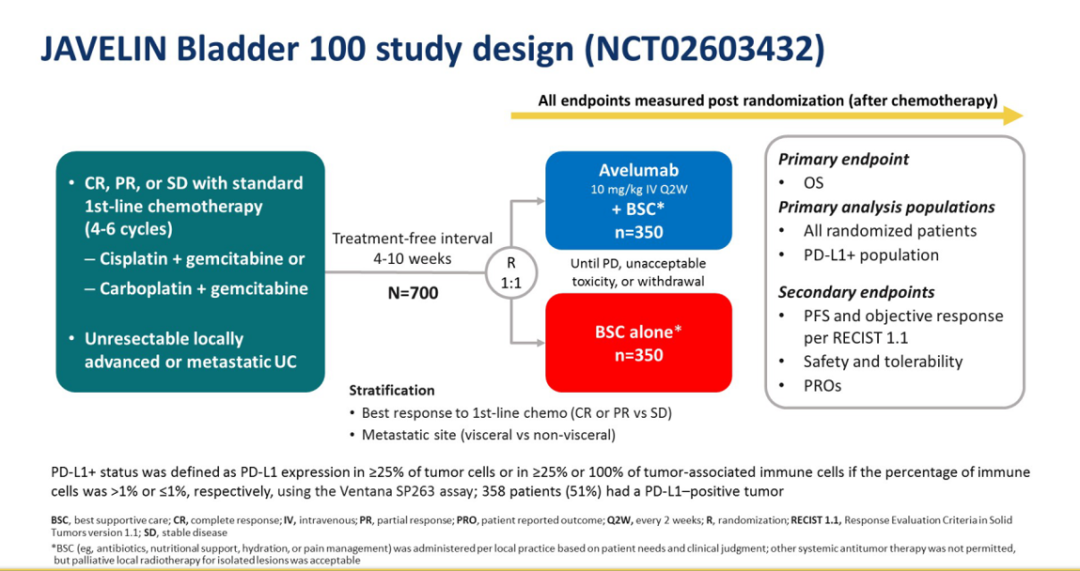 虞巍教授:您在本次ASCO大会上汇报了为数不多的LBA,即JAVELIN Bladder 100研究的结果。这项研究也是第一个采用抗PD-L1维持治疗得到OS获益的3期试验。首先请您再与我们分享一下这项研究的背景和主要结果。