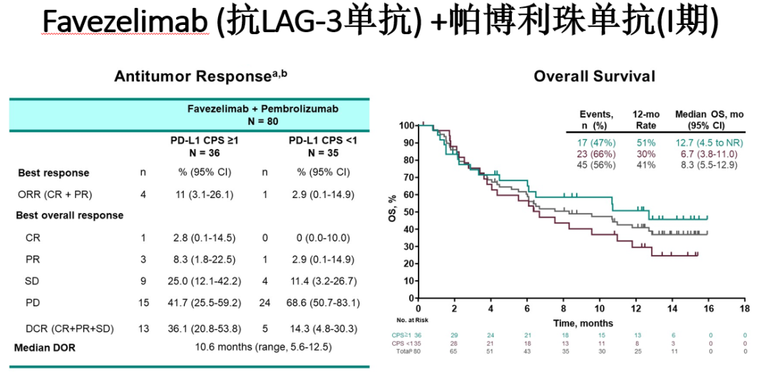 在抗LAG-3单抗Favezelimab联合帕博利珠单抗用于晚期结直肠癌患者的1期研究中看到PD-L1 CPS预测作用,双联方案在PD-L1 CPS≥1和<1的患者的ORR分别为11%vs 2.9%,DCR为36.1%vs 14.3%,mOS为12.7个月vs 8.3个月。也许免疫治疗在MSS晚期结直肠癌中渐渐迎来了曙光。