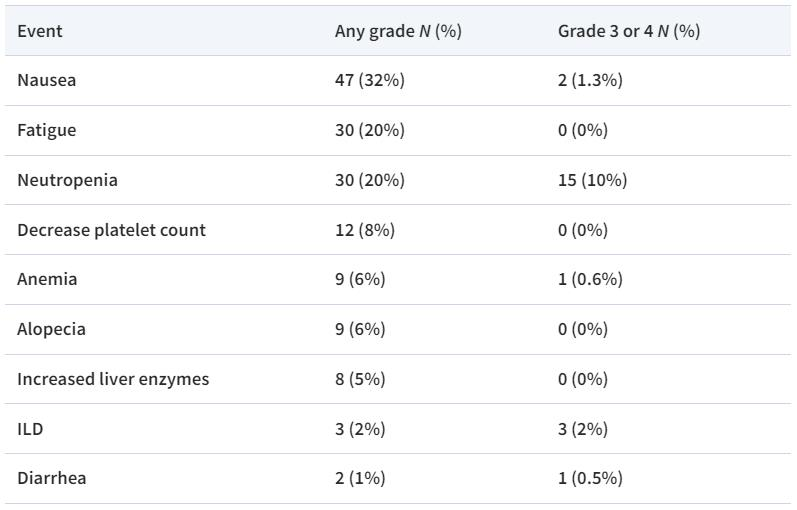 在接受T-DXd治疗的143例患者中,84例(59%)患者至少出现过一次AE。58例(69%)患者出现了中低度毒性反应(G1/G2)。最常见的AE是恶心(32%)、中性粒细胞减少(20%)和疲劳(20%)。贫血(6%)、肝毒性(5%)和腹泻(1%)并不常见。18%的患者出现了严重AE,其中最常见的是中性粒细胞减少(10%)、间质性肺病(2%)和恶心(1.3%)。37例(26%)患者因AE而减少剂量。值得注意的是,rwPFS(HR 1.13,95%CI:0.65~1.96,P=0.66)和OS(HR 1.59,95%CI:0.82~2.97,P=0.18)不受剂量减少影响。同样,根据毒性分级,生存结局也未发现差异(G1/G2 vs.G3/G4;HR 0.89,95%CI:0.42~1.85,P=0.74)。